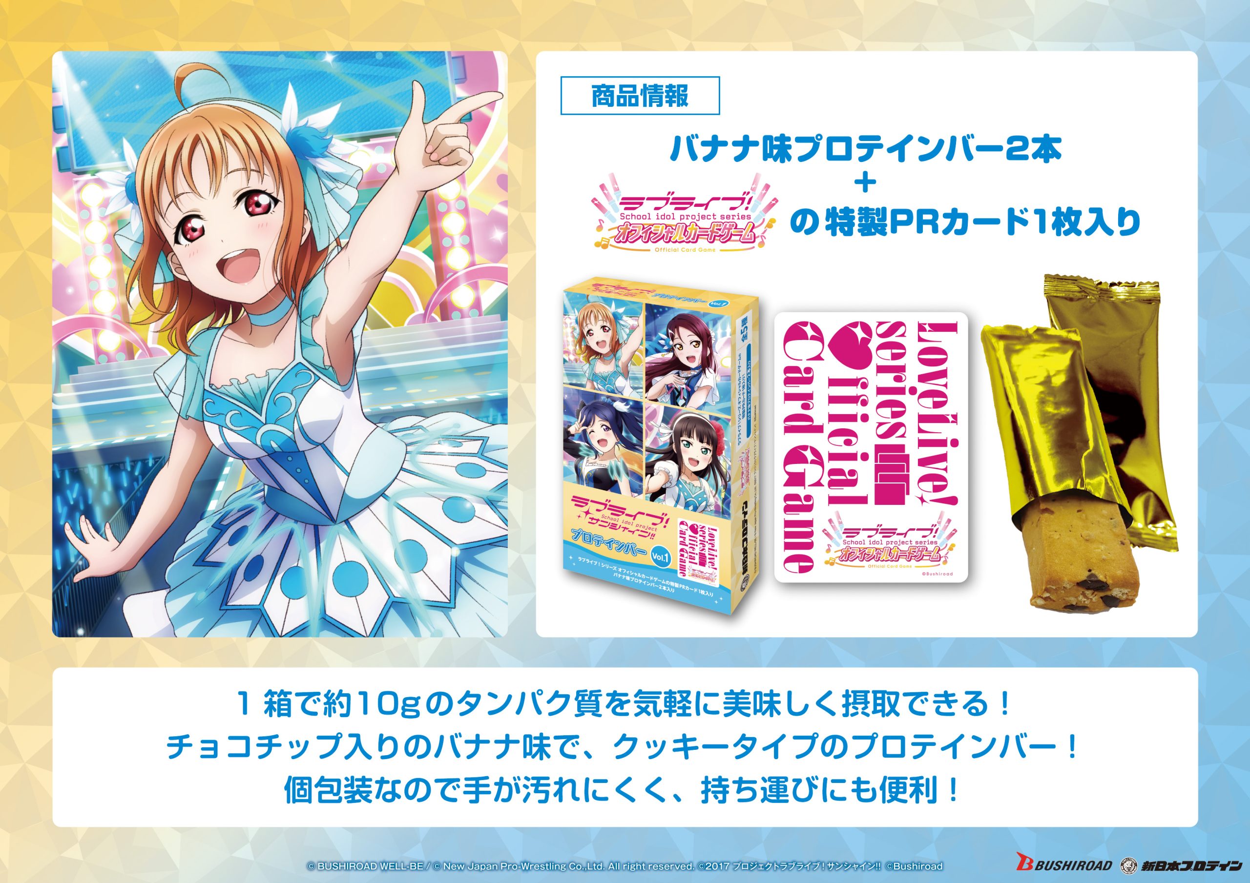バナナ味のプロテインバー2本と、 ラブライブ!シリーズ オフィシャルカードゲームの特製PRカードがランダムで1枚封入!